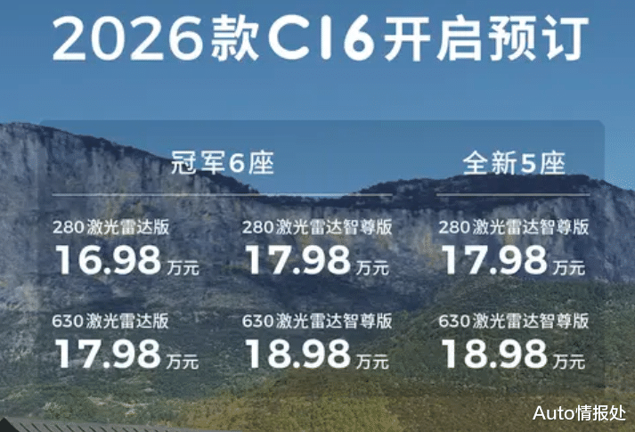 日前,Auto情报处从领跑汽车官方处获悉,2026款零跑C16开启预售,零跑C16定位中大型SUV,提供增程式和纯电版本可以选择,2026款共推出6款配置车型,预售价格为16.98-18.98万元,座椅提供5座和6座可以选择,全系还将标配激光雷达。