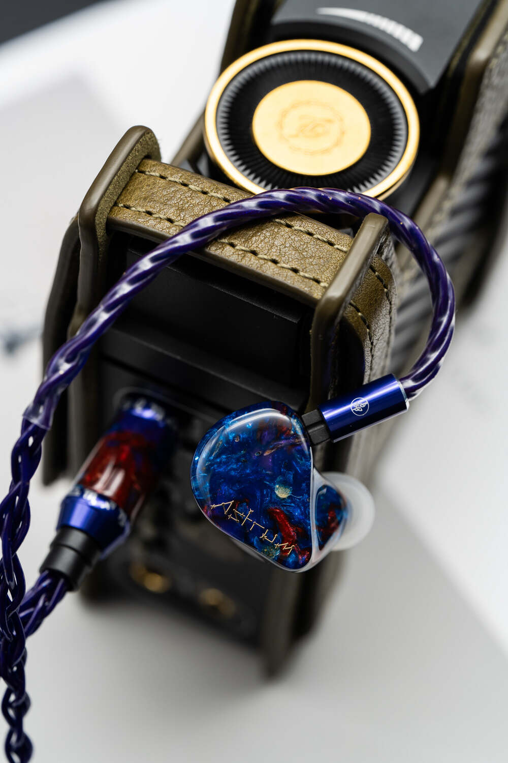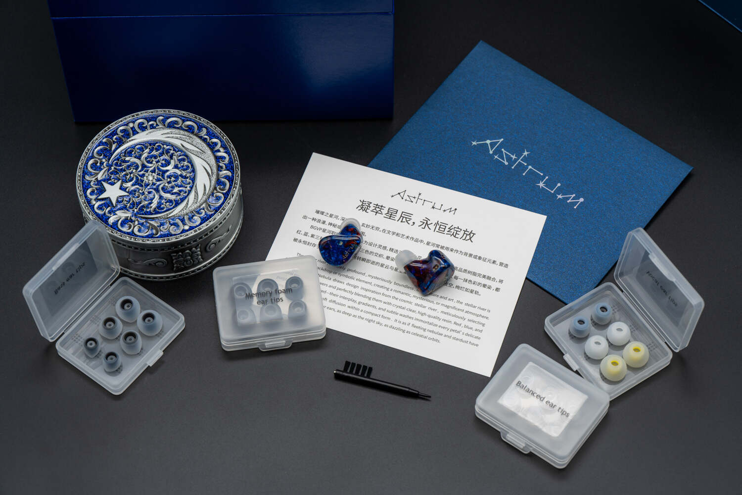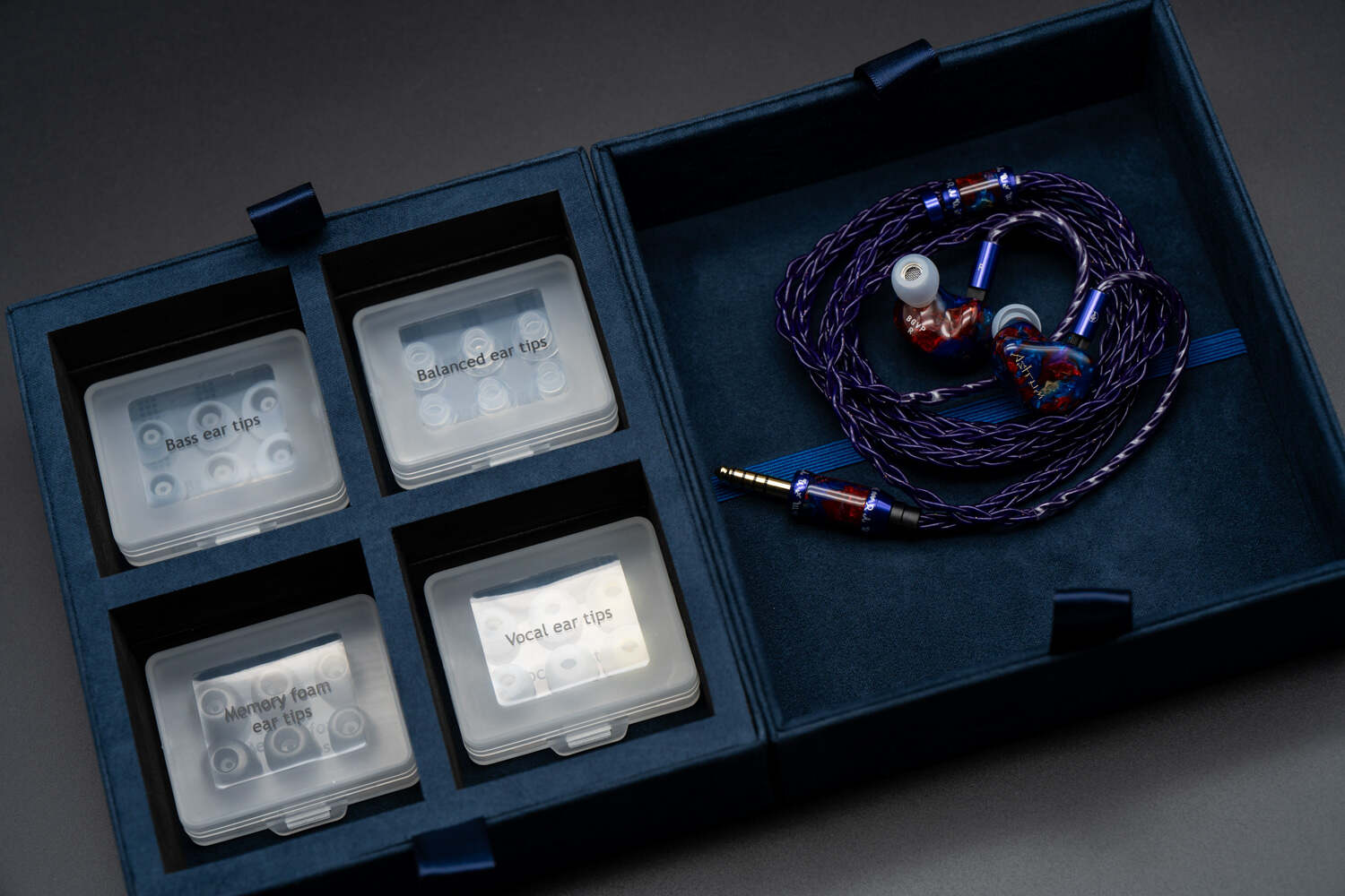 星河的面板首先第一印象就抓住了很多人的眼球:深蓝与红色的大面积不规则纹理与色块交织,形成自然流畅且与众不同的视觉观感;漂亮的方形包装盒,开启后如同化妆盒般,内含精细的“流沙”设计,配合立体感的Logo有“水落石出”之感;而星河的锌合金立体星月工艺收纳盒也为这款产品增色不少。除此以外,星河的线材外皮色调和五金的设计也与“星河”的主题有所呼应。总的来说,星河从包装到配件再到耳机本体,都呈现出一种近似艺术品般的气质,这在入耳耳机,尤其是定价不足5k的耳机中是很少见的。