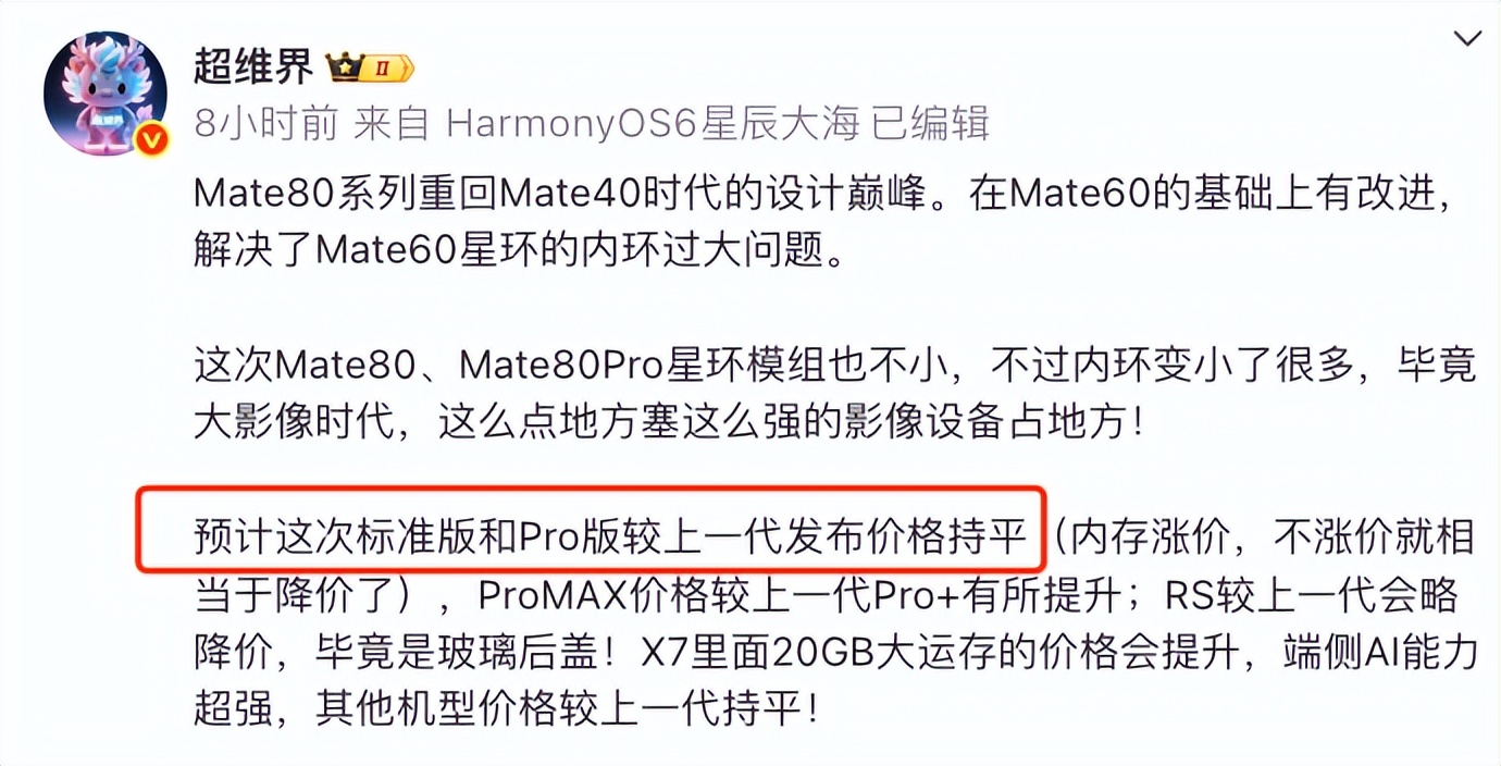 选择在11月25日发布,这个时间点可谓恰到好处。一方面避开了9月的旗舰混战,另一方面又赶在年末换机潮之前。眼下市场上同价位竞品不多,Mate80系列很可能成为年底最值得关注的旗舰机型。