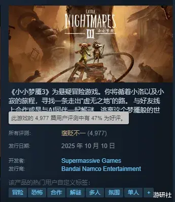 在游戏一代和二代在Steam上均维持90%以上好评率,近50000条评测的良好口碑基础下,该系列的最新作《小小梦魇3》于6天前正式发售,但意想不到的是,目前游戏好评率仅为47%,维持在“褒贬不一”阶段。
