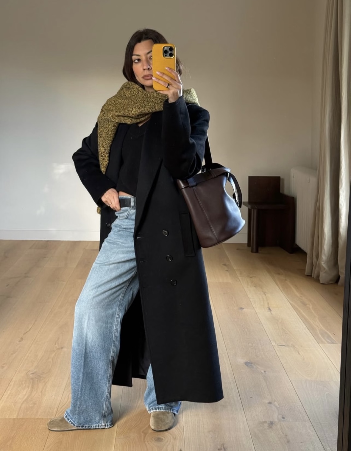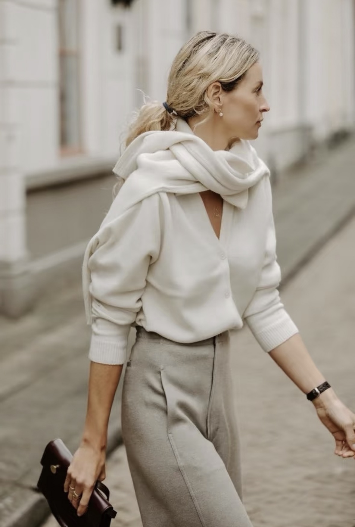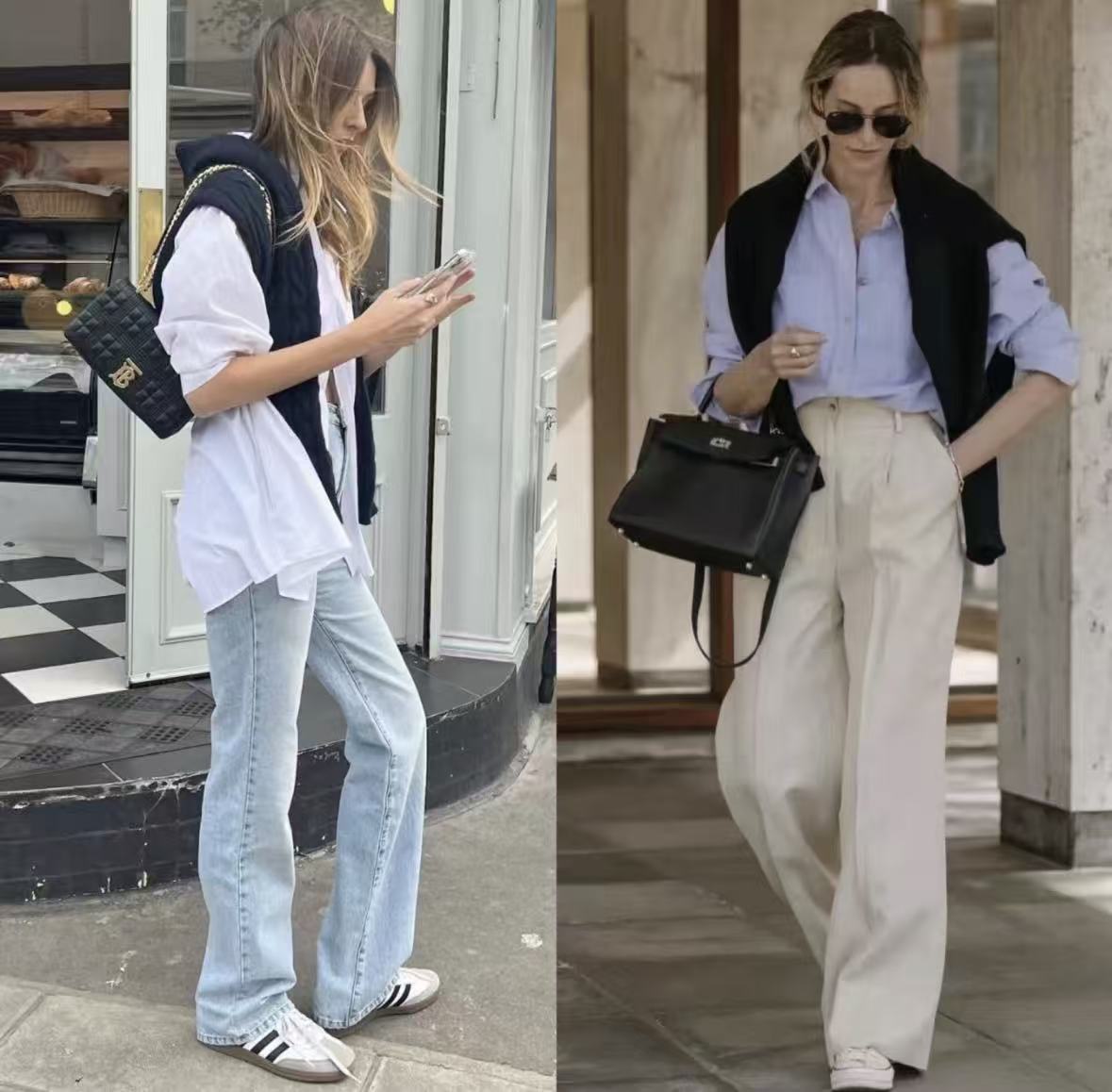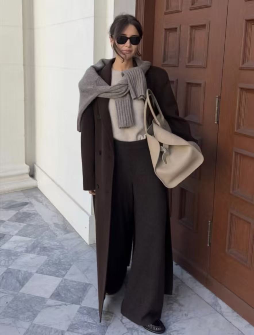 心头好:我特别推荐用一件略 oversize 的针织开衫或粗棒针毛衣来操作。它形成的V型线条能修饰肩背,瞬间提升随意又高级的氛围感。早上送孩子上学、周末逛市集,这么一披,保暖和时髦全有了。如果怕滑落,用一枚有设计感的胸针在胸口固定一下袖子,或者像图中那样系上腰带,利落感马上就出来了。