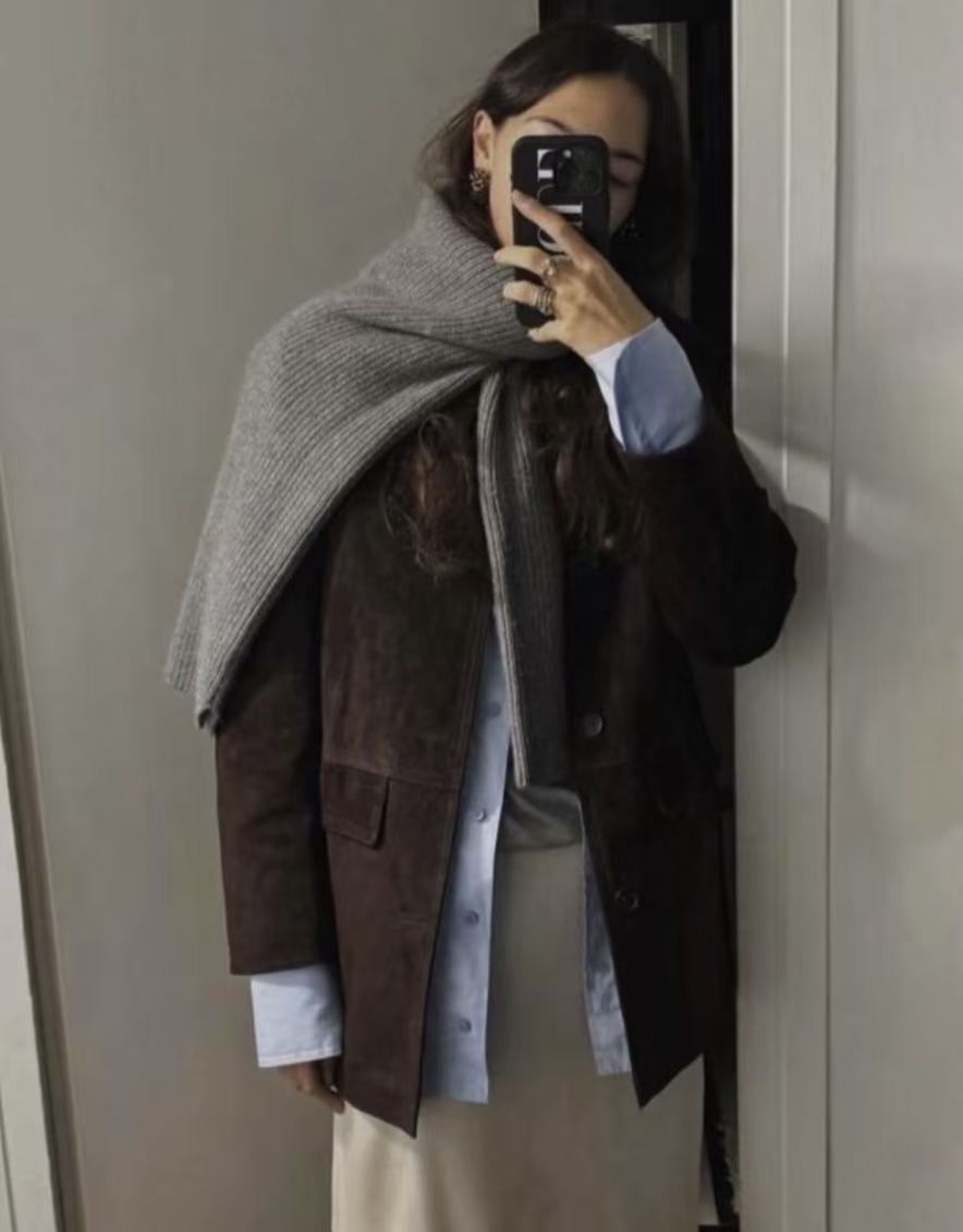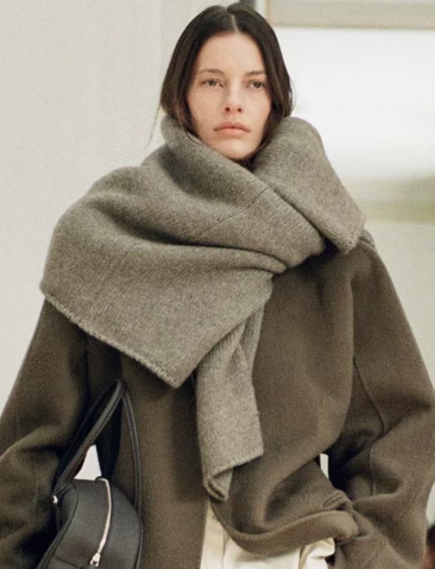 经验谈:千万别把结打得工工整整,随意一系才是精髓。我常用一件柔软的羊绒旧毛衣这么做,亲肤又暖和。颜色搭配上有个偷懒秘诀:选择和你的内搭、鞋子或包包同色系的毛衣来当“围巾”。 比如,一身燕麦色内搭配米白色“毛衣围巾”,那种柔和高级的层次感,是买来的围巾很难替代的。