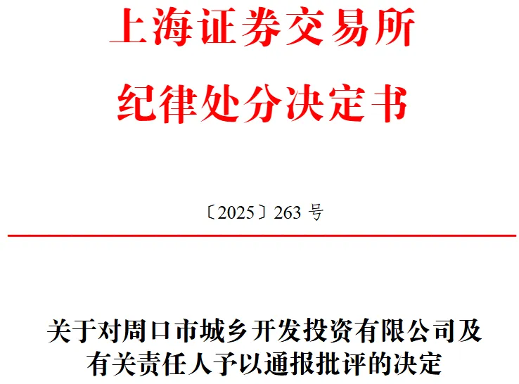 针对上述多项叠加违规行为,上交所对周口城乡开发公司及时任董事长赵某、时任总经理兼信息披露事务负责人王某刚、时任财务负责人束某华予以通报批评。该处分结果将同步通报中国证监会,相关记录永久存入资本市场诚信档案。