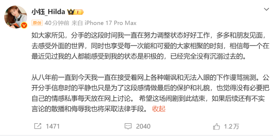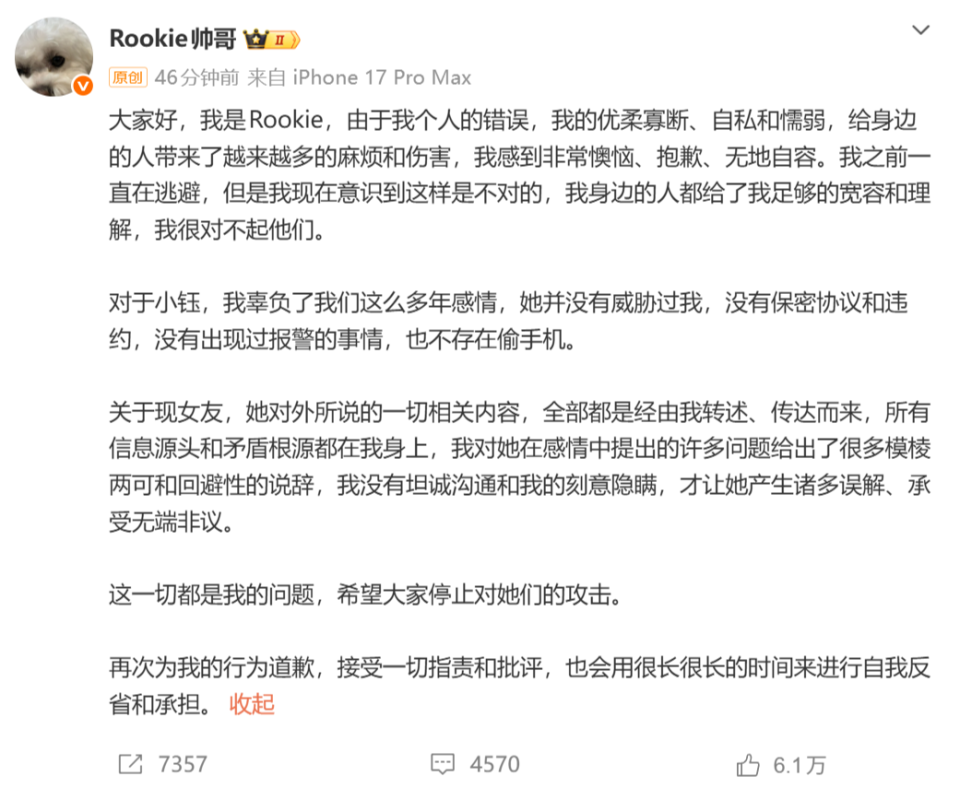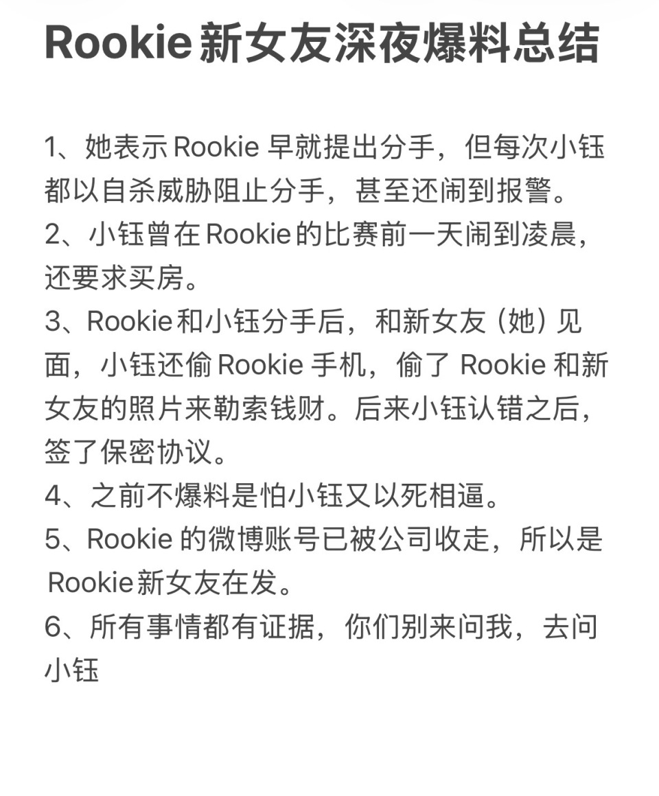 小钰没有说太多,她表示自己一直在从这个感情里走出来,不希望把自己的情感私事放出来讨论,只希望闹剧结束!而Rookie接着也回应了,他表示这些都是他自己带来的问题,是自己的错误导致一系列的发生!首先他表示没有“偷手机、保密协议、报警”这些事情,这些都是自己跟现女友转述过程里的一些说辞,让她产生误解了!