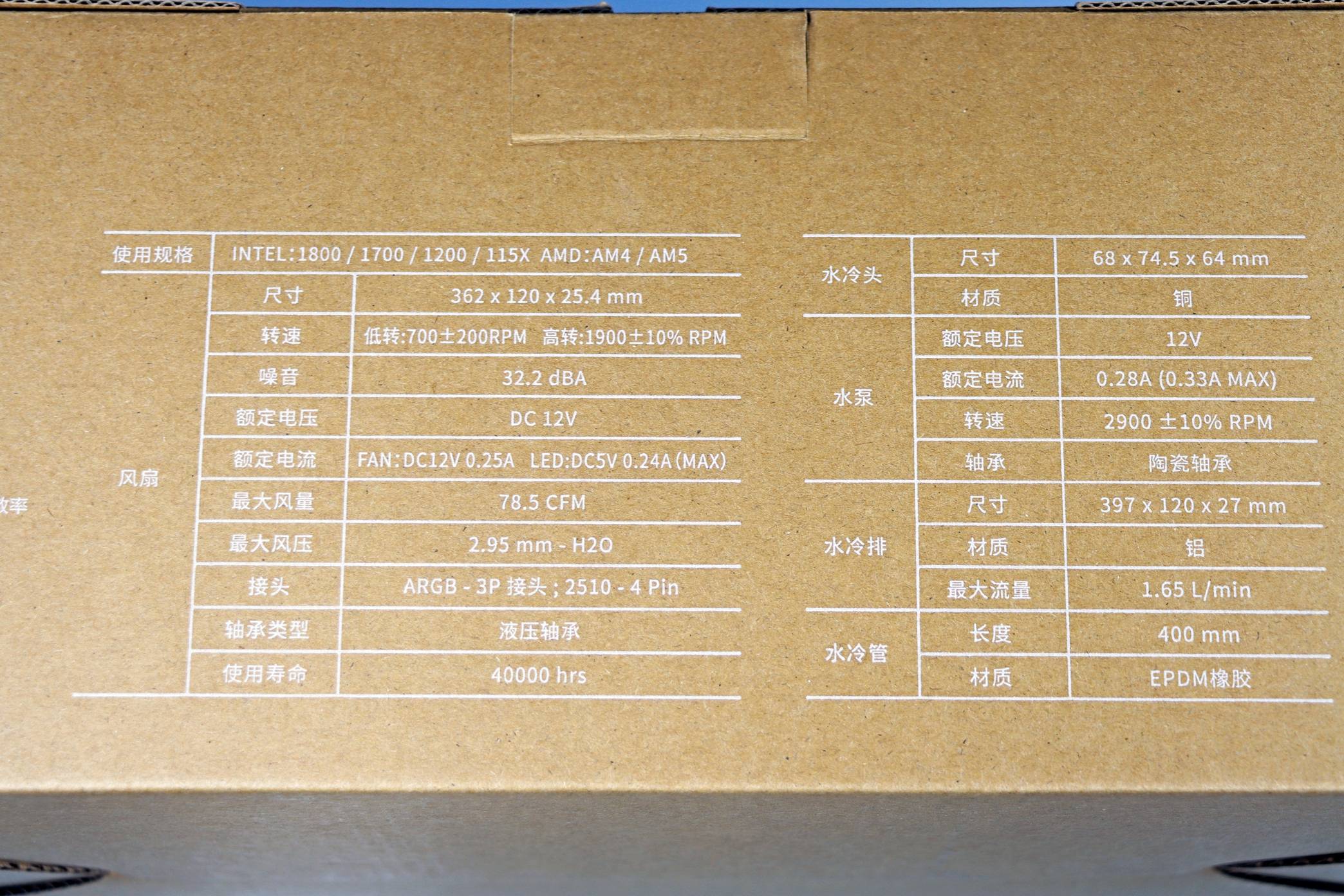 ▲ 钢影·木语 360 水冷散热器的参数在盒子上有展现。水冷散热器的标称满载噪音为 32.2 dBA。三把风扇提供的最大风量为 78.5 CFM,最大风压为 2.95mm-H2O,风扇采用液压轴承,标称使用寿命为 4 万小时,水泵额定转速为 2900 ± 10% RPM。