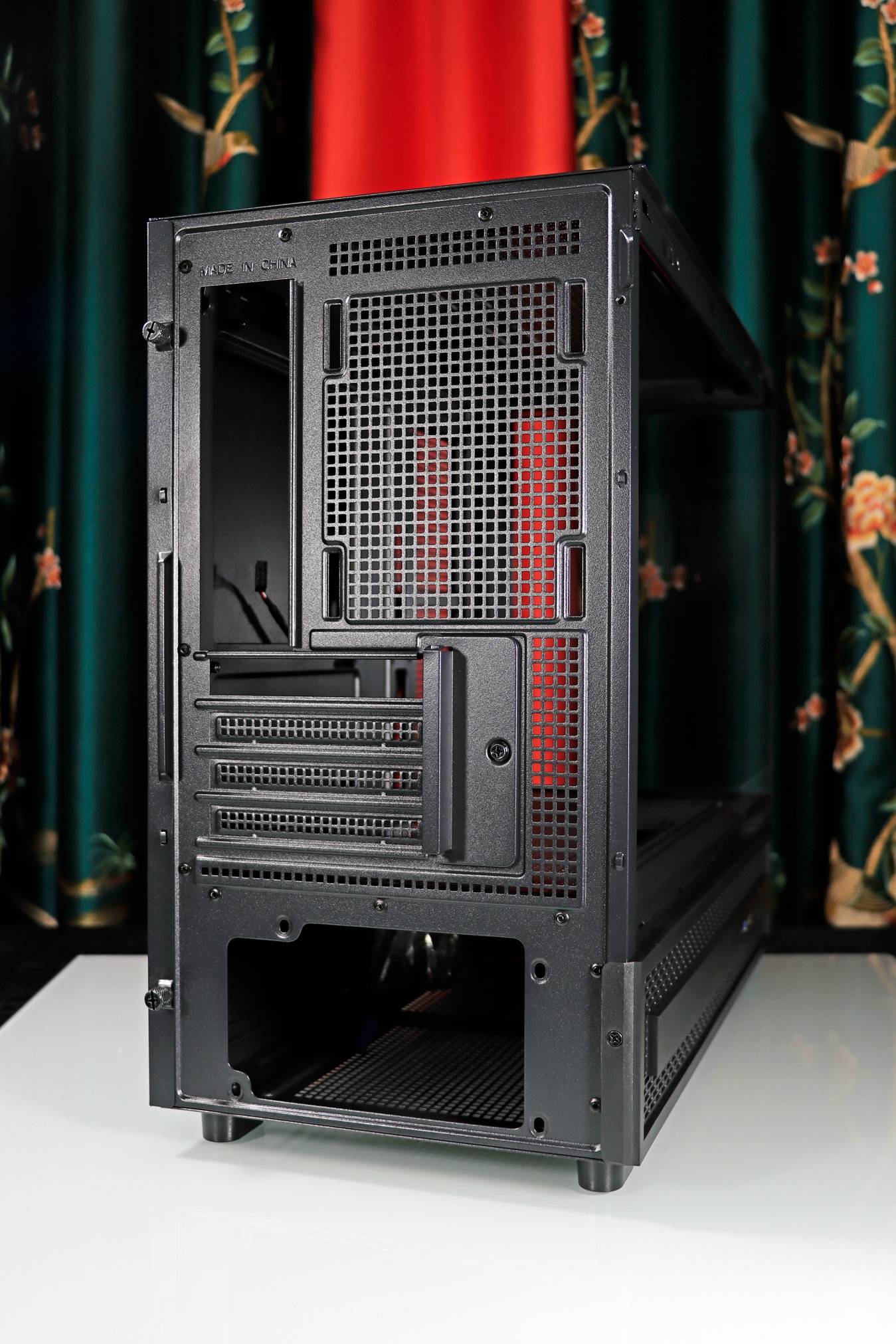 ▲ 从机箱后部可以看到,机箱为顶部安装的水冷散热器做了兼容性优化。机箱提供有 4 * PCI 插槽,可以支持高端显卡的安装与使用。机箱的背部也有优化散热的设计,让机箱可以更通透。