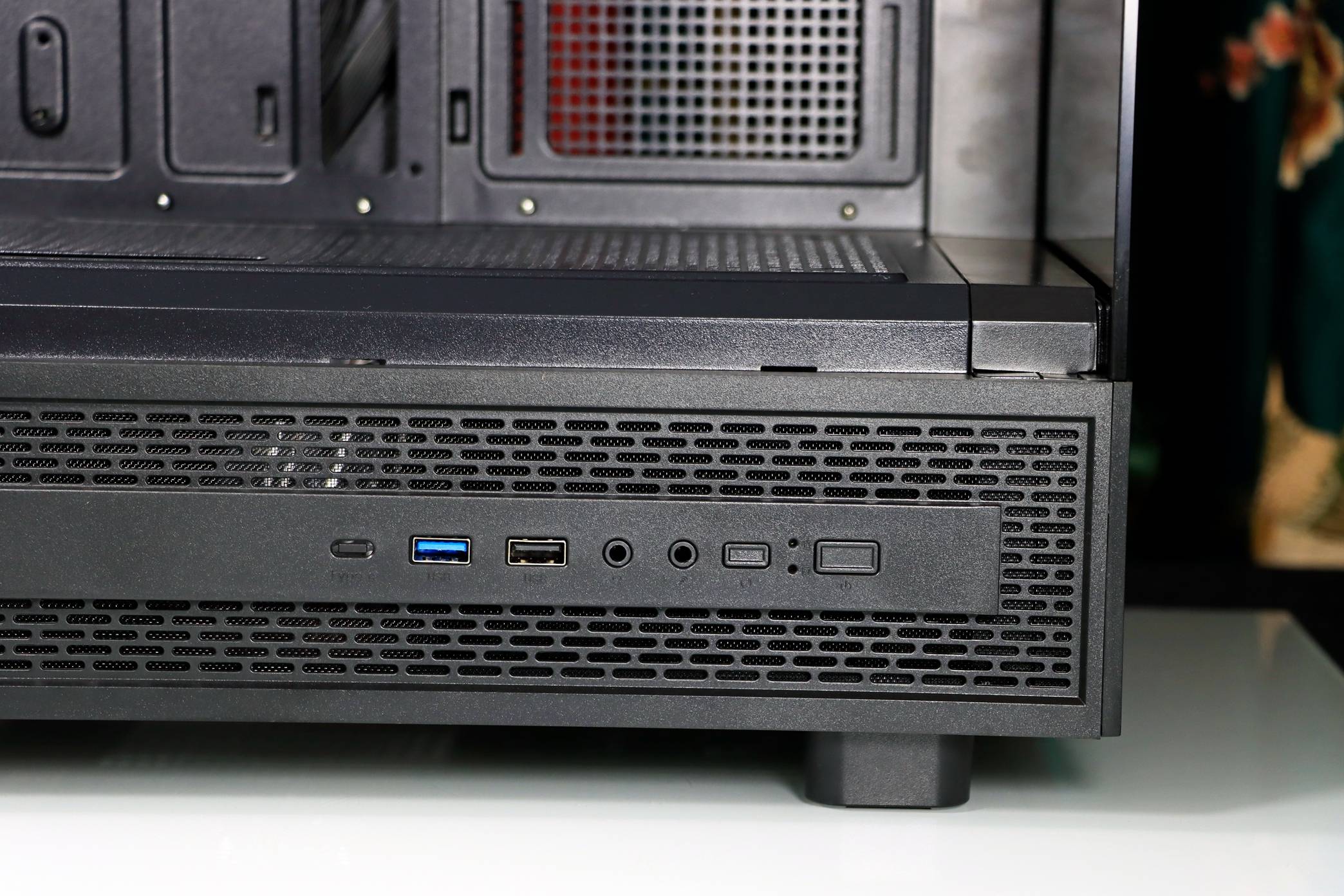 ▲ 电源硬盘仓有着丰富的通风孔矩阵设计,机箱 i/o 面板也在这里。从右到左依次是 :电源键、电源与 HDD 指示灯、重启键,3.5mm 耳麦同轴接口。USB 2.0 接口、USB 3.0 5Gbps 接口、USB-C 接口。
