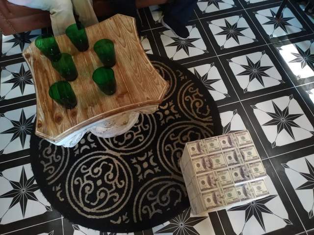 注意茶几旁的成堆美元,那其实是个凳子,很有创意的物件。