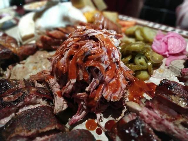 肉食者狂欢的烟熏盛宴拼盘,包括:安格斯烟熏牛胸肉、烟熏猪肋排、烟熏猪软骨、手撕猪肉、熏烤春鸡、自烤牛肉肠、自烤芝士猪肉肠、新墨西哥辣味肠等。