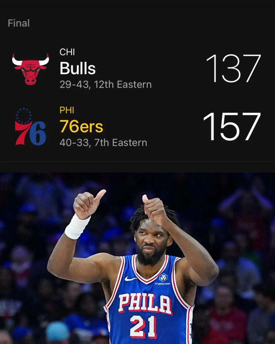 常规赛,76人主场157-137大胜公牛。