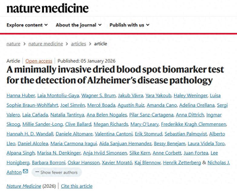 1月5日,《 Nature Medicine 》的研究报道“A minimally invasive dried blood spot biomarker test for the detection of Alzheimer’s disease pathology”,这项由多国研究机构合作的DROP-AD项目,向我们展示了一种更为“轻盈”的可能性:仅仅通过指尖采血,将几滴毛细血管血干燥在特制的卡片上,是否就能精准捕捉到大脑深处的病理变化?这不仅是技术的微调,更是对诊断可及性的一次深刻试探。