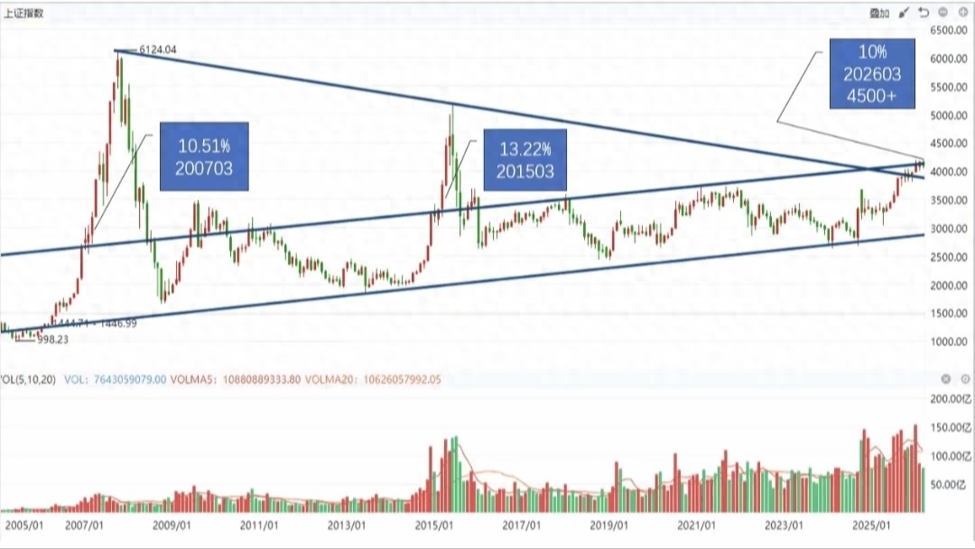 最近大家大概率都被指数绕得晕头转向:明明前期走势还算稳健,突然开始回调,围绕3800多点反复震荡,有人慌着割肉,有人等着抄底,还有人拿着持仓忐忑不安,不知道这波调整是行情结束,还是短暂蓄力。其实根本不用瞎猜,A股有一条十几年的核心趋势线,能直接定中长期牛熊,就是把2007年的历史高点6124点,和2015年的牛市高点5178点连起来的那条线。这条长期下降趋势线在本月正好运行到3850点的位置,近期的回调,本质就是指数突破长期压力后,对这条关键趋势线支撑力度的回踩确认。