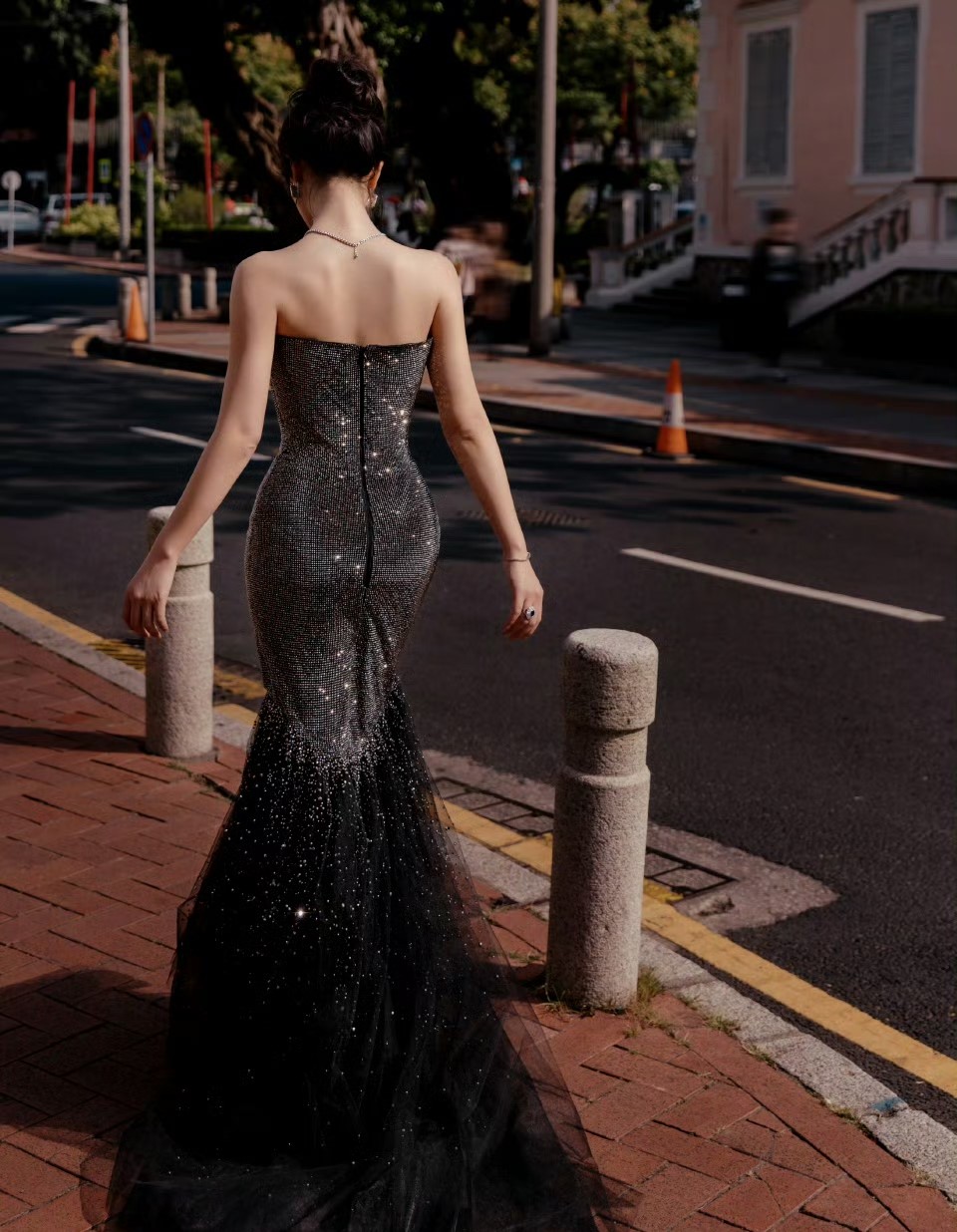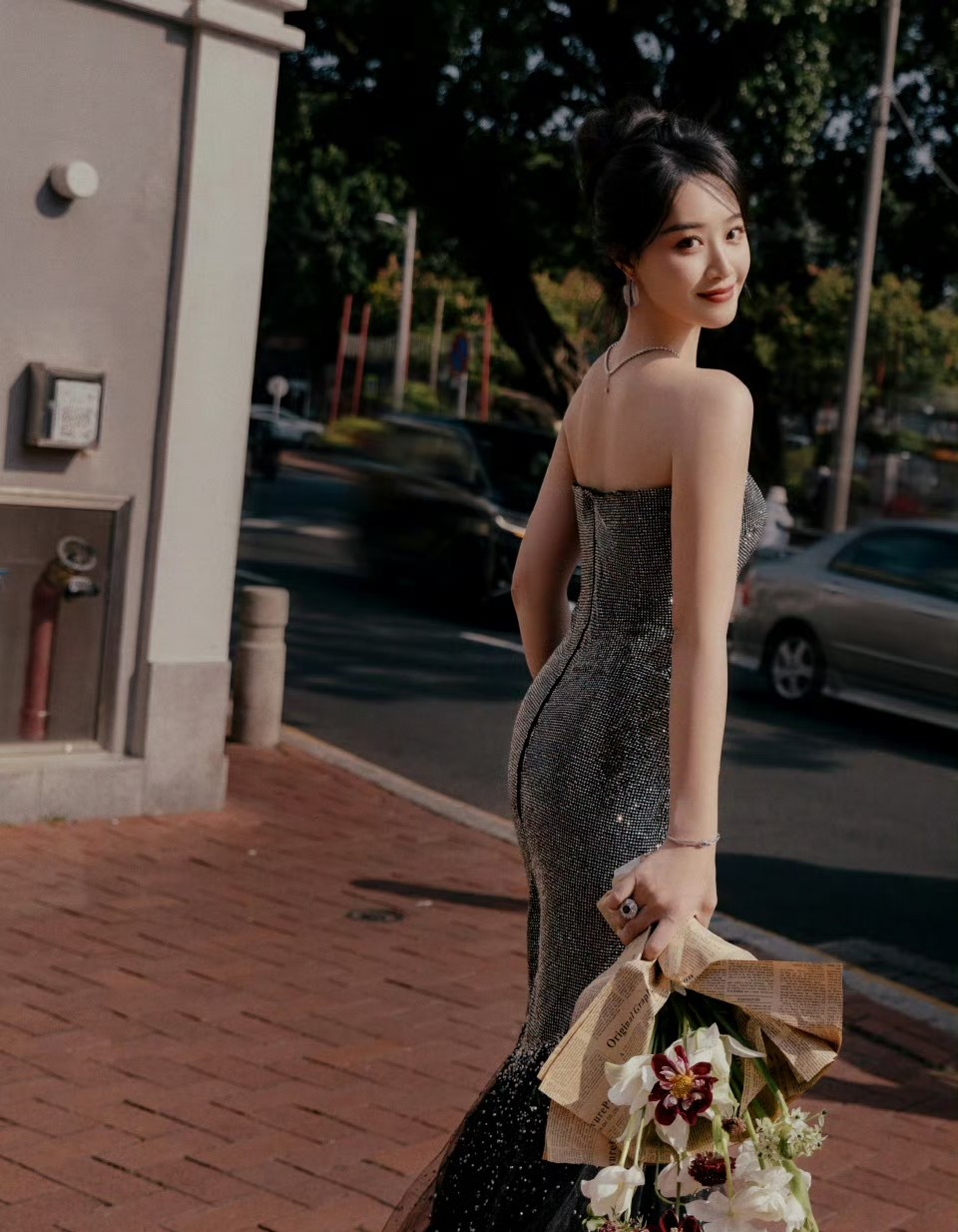 腰部以紧身剪裁收束,向下延伸出人鱼线裙摆,亮片逐渐过渡为黑色薄纱材质,纱面上缀满星点细闪,走动时裙摆轻晃,像把深夜的星光揉进了裙裾里。