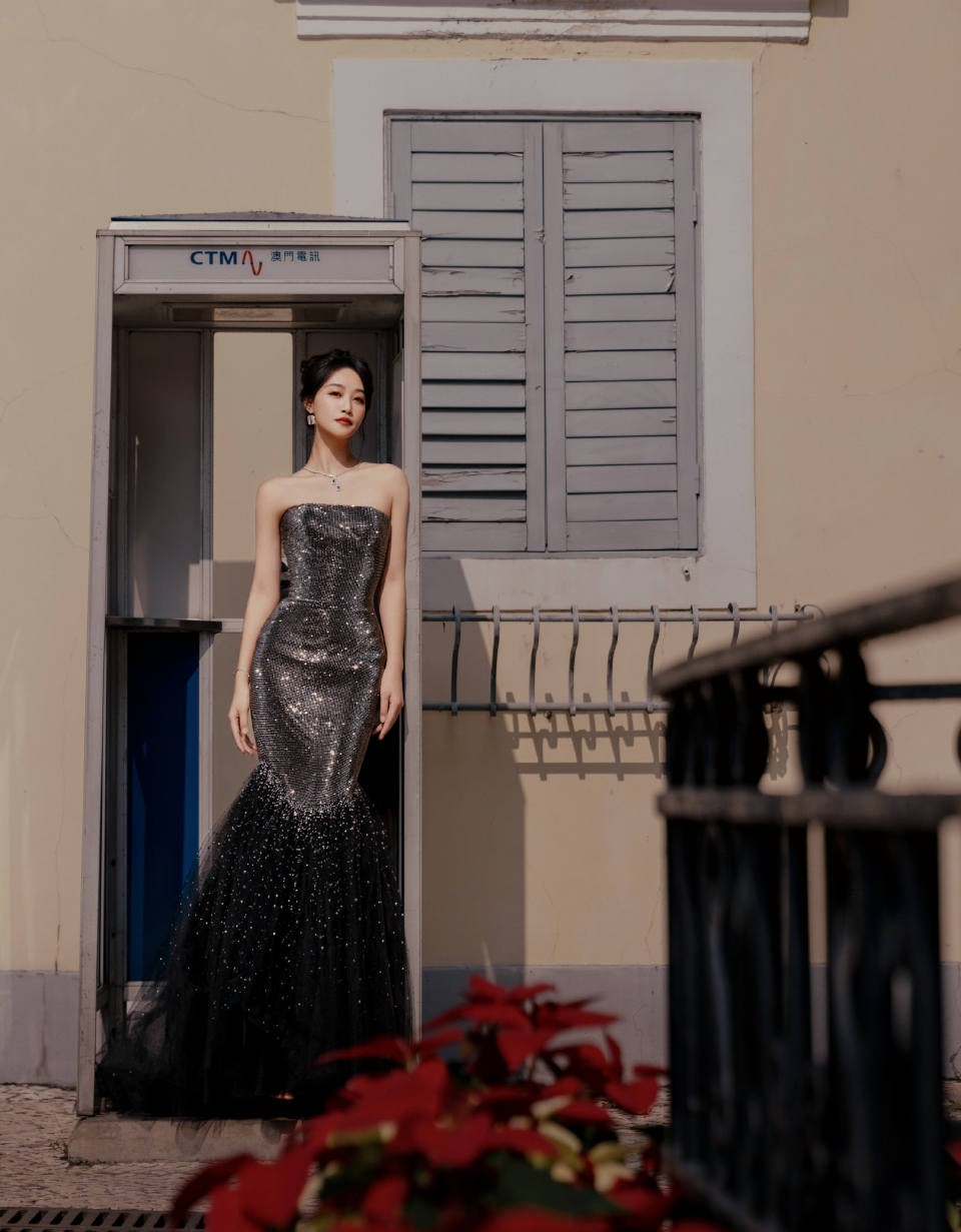 不同于高定礼服常伴的红毯、场馆等“精致场景”,蓝盈莹这次直接把鎏银礼服“嵌”进了澳门路环的市井烟火里,复古电话亭的金属壳带着磨旧的痕迹,街道路面是踩得发亮的砖石,旁边停着的黄绿代步车裹着生活气息。