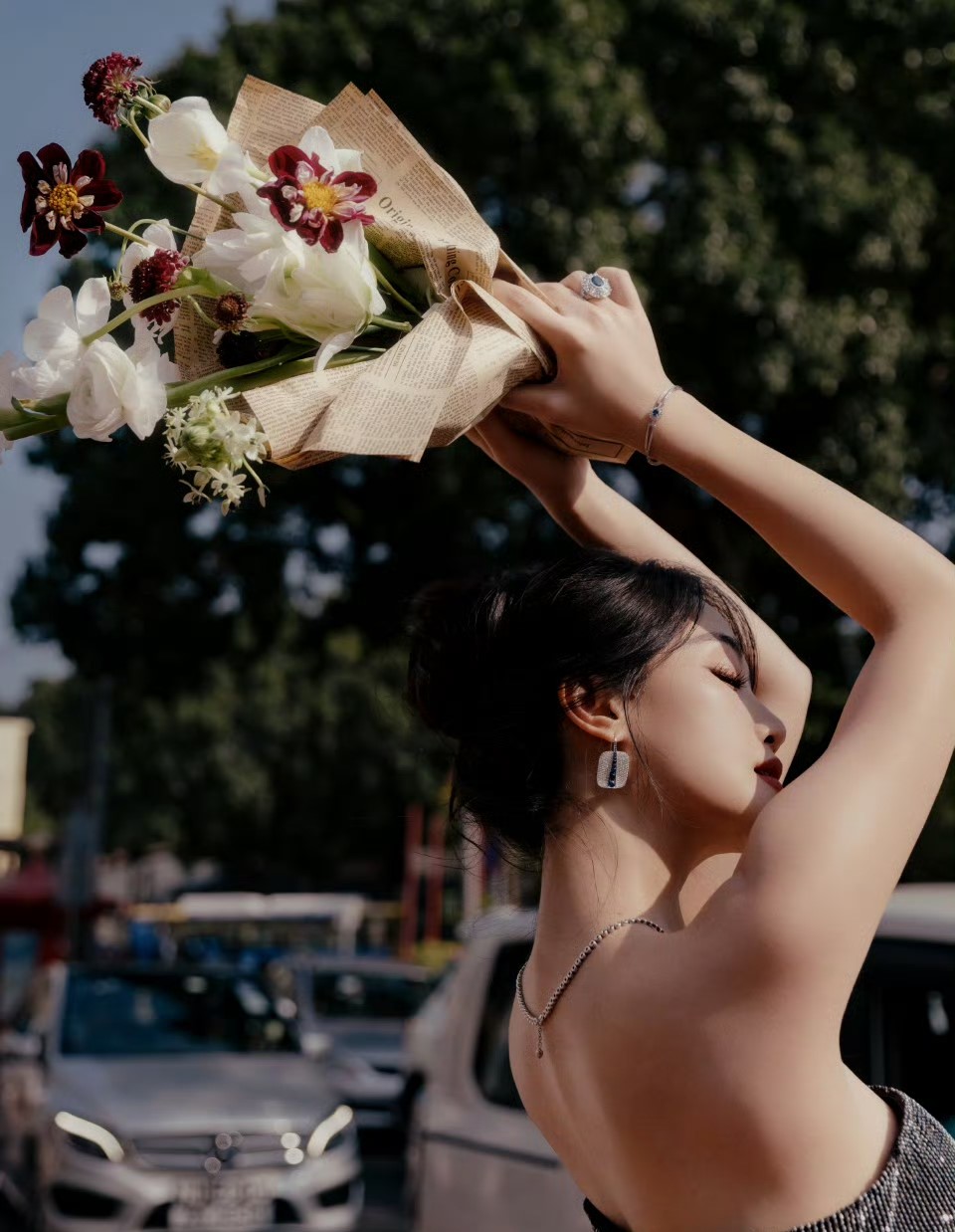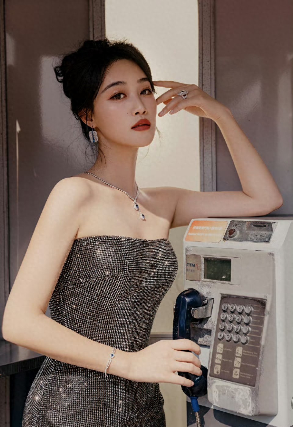 她一会儿靠在路牌杆旁拎着报纸裹的花束,一会儿轻搭旧电话亭的听筒,松弛的状态让“高定”不再是距离感的代名词,反而成了街头氛围感的“加分项”。