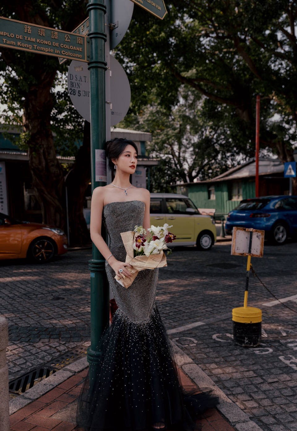 这件礼服的设计堪称“细节杀”:抹胸版型恰好勾勒肩颈线条,上身铺满细密的鎏银亮片,在澳门午后的阳光下折射出冷调碎光。