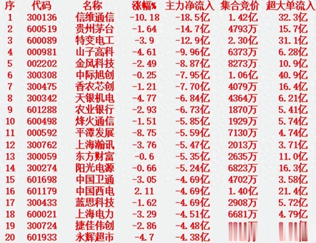 1月21日收盘,主力资金“大幅卖出”的100名单:
