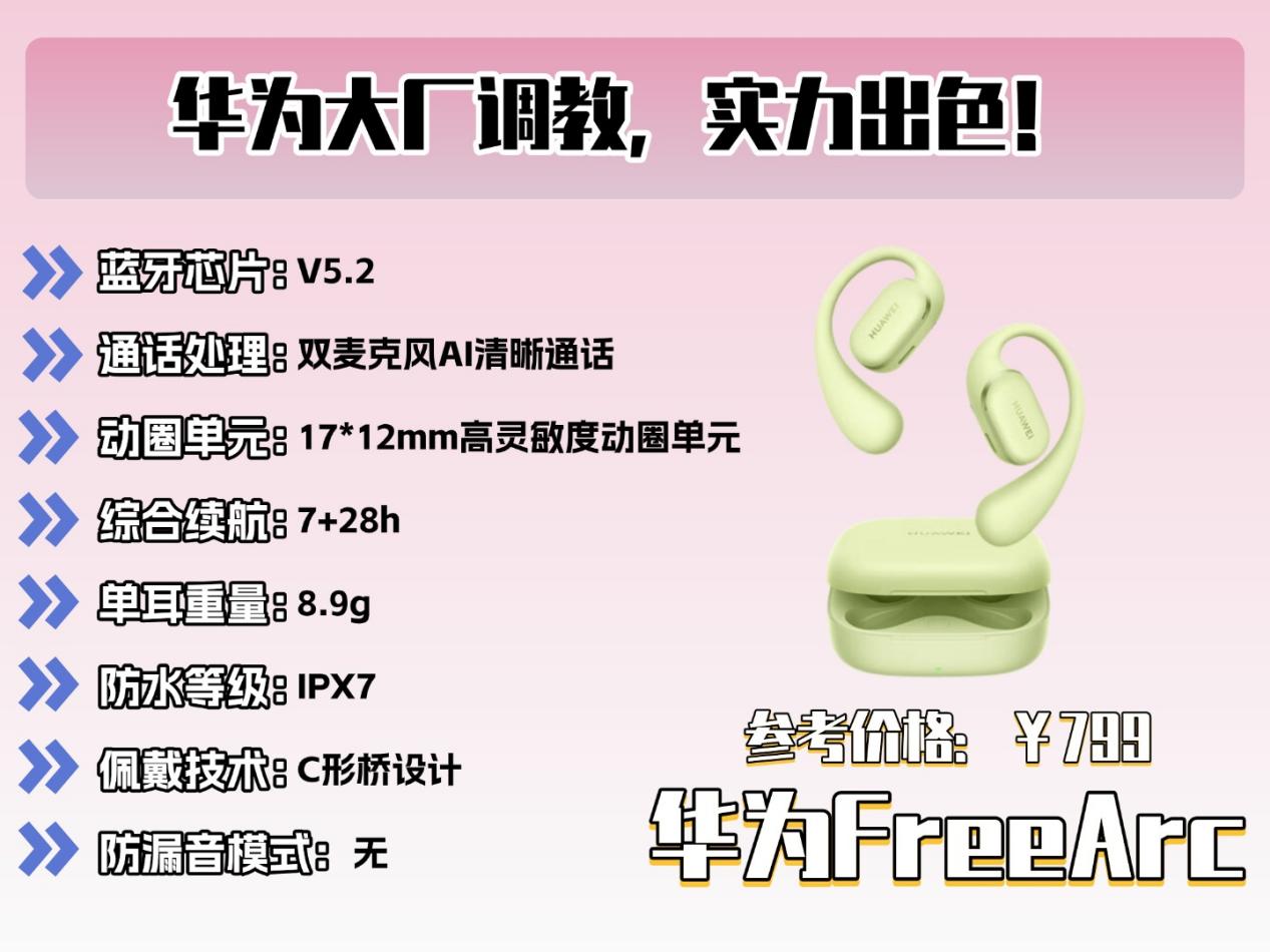 华为FreeArc价格:799 元推荐程度:★★★★推荐理由:佩戴舒适稳固,音质出色,防水且续航长,适配多场景超省心。