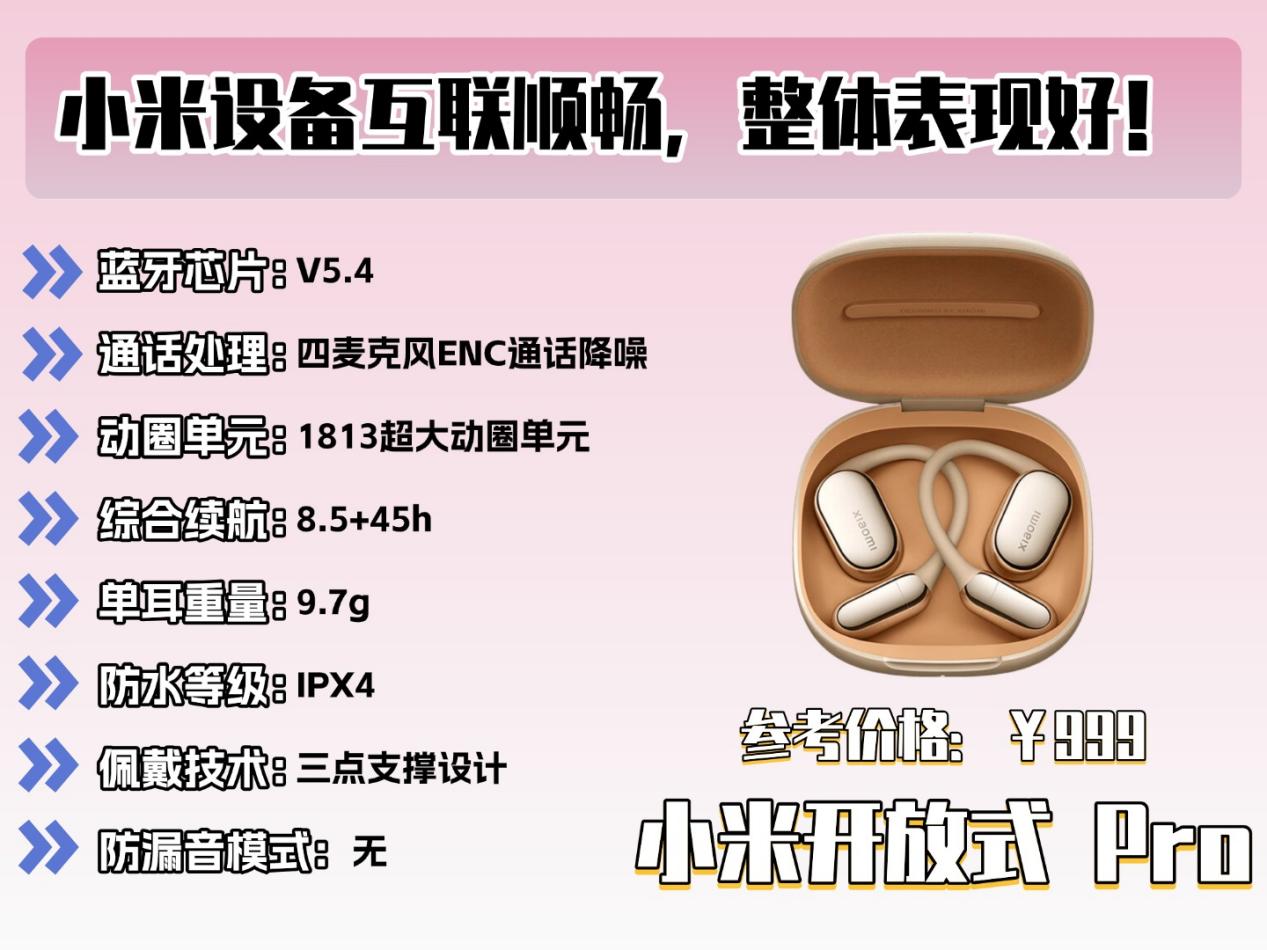 小米开放式耳机pro价格:999 元推荐程度:★★★★★推荐理由:和小米生态链适配度高,适合小米用户入手,功能全面无短板。