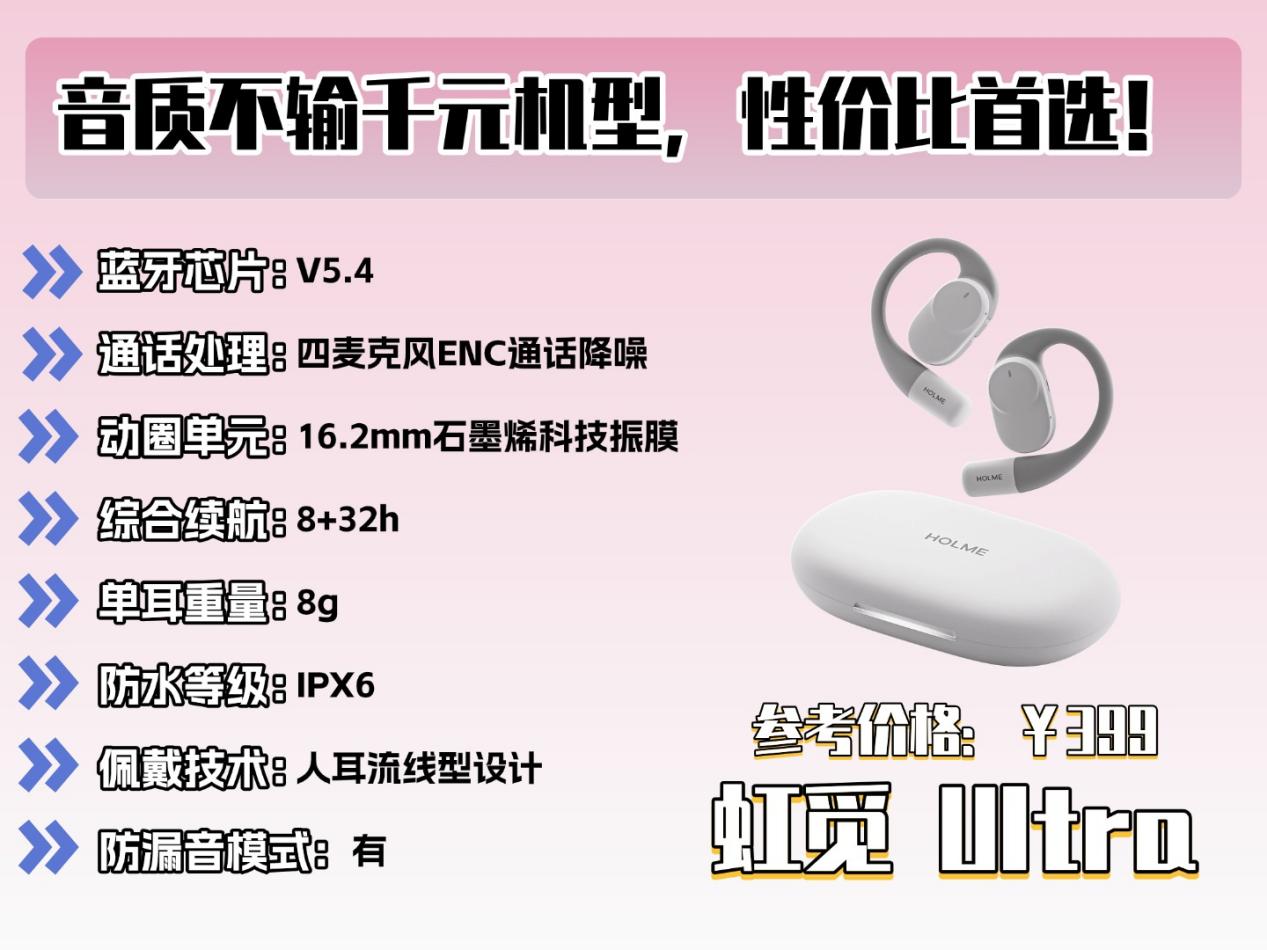 很多人选开放式耳机,最头疼的就是戴久了难受、还容易漏音,但虹觅这款直接把佩戴体验拉满了!它专门按照人耳轮廓做了流线型机身,能自然贴合耳廓,还能对准耳道,不光声音更集中、听感更清晰,还能大大减少漏音,日常用更安心。耳机用的是亲肤液态硅胶,触感柔软不磨耳,单耳才 8 克,长时间戴也不闷不痛。再加上IPX6 级防水,平时出汗、遇上小雨都不用怕,实用性直接拉满!