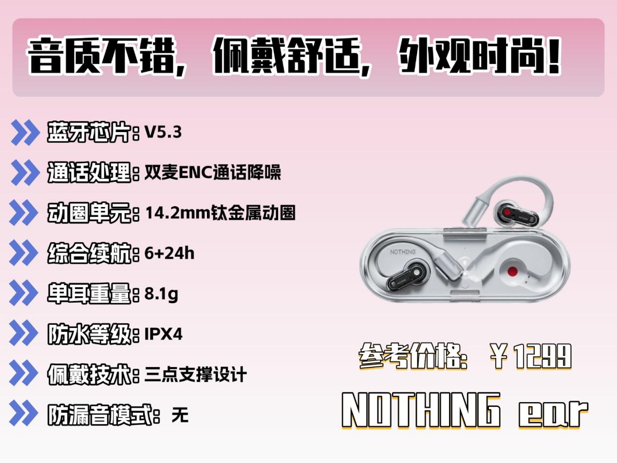 NOTHING ear ( open )价格:1299 元推荐程度:★★★★推荐理由:耳机外观设计华丽,音质表现出色,整体表现好,预算够可以冲!