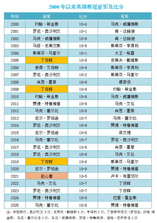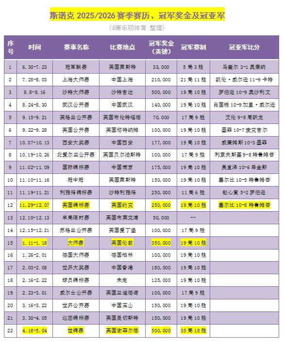 至此,2025-2026赛季已进行了12站比赛,在前11站比赛共11名不同的球员获得冠军之后,在英锦赛上,塞尔比打破这种平衡,一人独得2冠!而获得29个排名赛冠军的特鲁姆普,本赛季继续0冠!