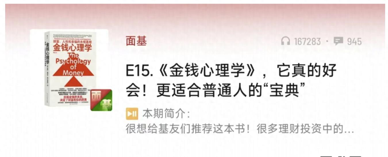 《金钱心理学》当然是给人最多惊喜的,做节目介绍这本书时,「面基」订阅刚破2万,但这期节目靠自然的长尾流量和一些小红书博主的推荐,实现了16.7万的播放。