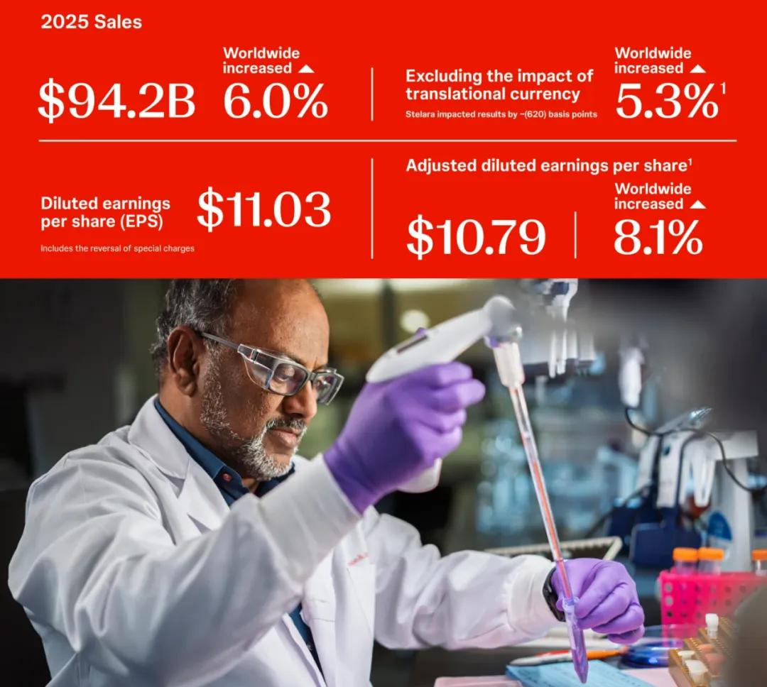 北京时间2026年1月21日,强生发布了2025年第四季度及全年财报。数据显示,强生第四季度销售额达到246亿美元,同比增长9.1%;全年销售额达到942亿美元,同比增长6.0%。