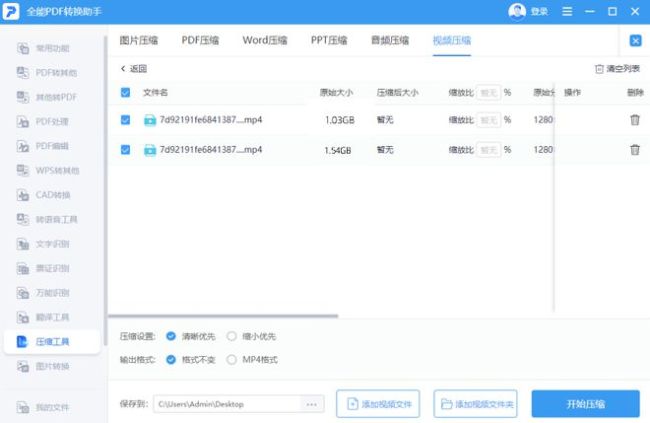 ①打开【全能PDF转换助手】,选择【压缩工具】,根据文件类型选择工具;比如视频压缩,选择【视频压缩】,然后将视频添加到文件。