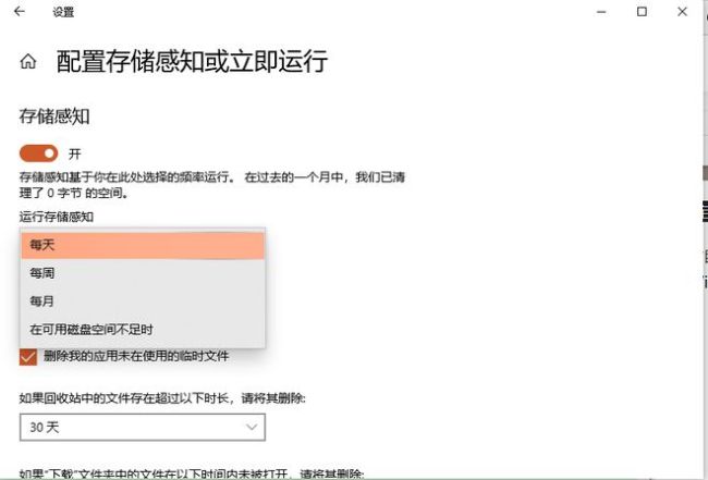 ②这里可以自定义清理时间,按自身需要进行选择,然后系统就会按照设置的时间定期清理临时文件啦。