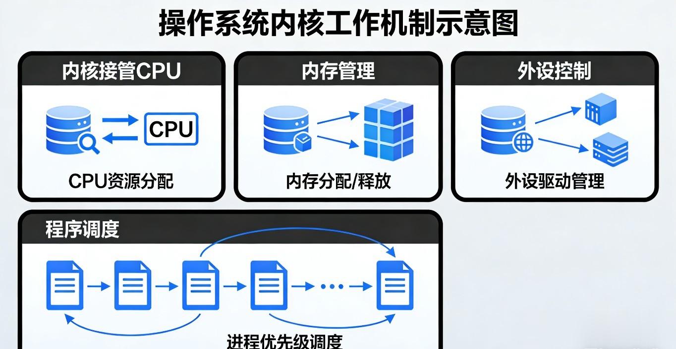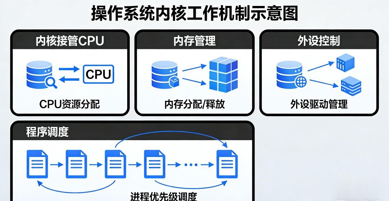 CPU就像一个超级厉害但一次只能做一件事的小工人。而电脑里同时运行着浏览器、音乐播放器、杀毒软件等无数程序,都想使用CPU。操作系统内核就是那个公平的“调度大师”,它通过进程调度机制,决定哪个程序可以使用CPU,以及使用多久。