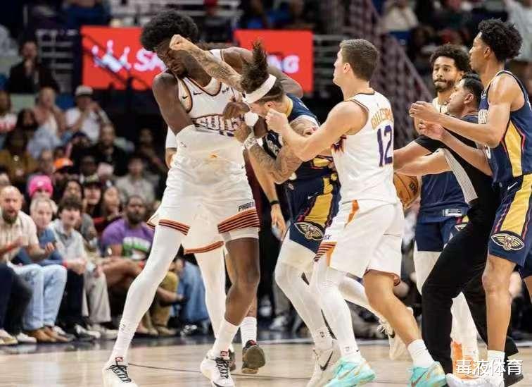 另一场是鹈鹕和太阳的冲突。原本这场比赛关注的人并不多,却因为第三节末段的一次激烈冲突,瞬间成了社交媒体上的热门话题。当时距离第三节结束还有两分钟左右,太阳队持球进攻。在一次对抗中,太阳中锋马克·威廉姆斯和鹈鹕后卫阿尔瓦拉多发生口角,随即互相推搡,情绪迅速升级为肢体冲突。