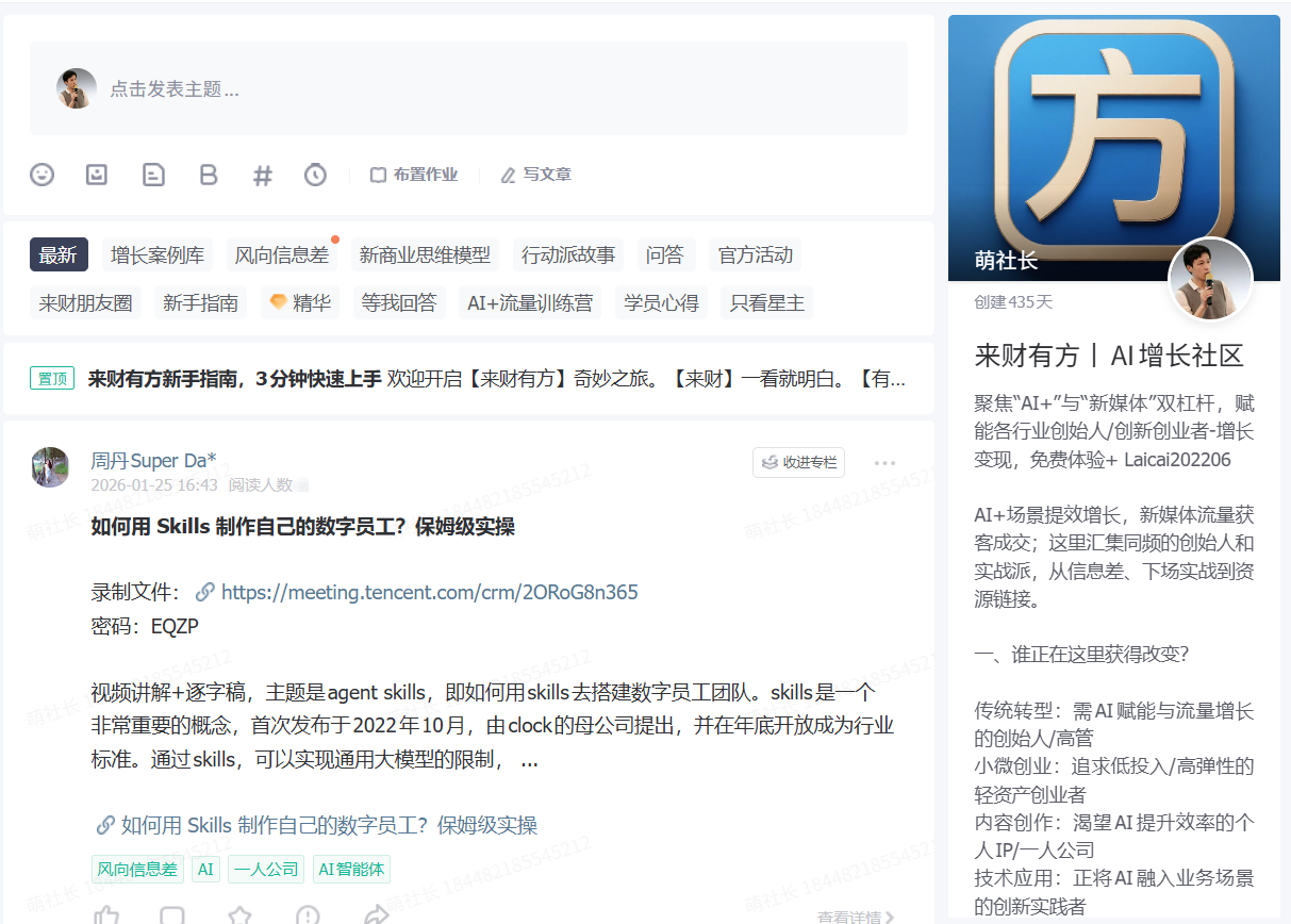 定位:社区的“中央数据库”和“信息枢纽”。它不是闲聊群,是一个沉淀了超过2000+条各行各业老板/一人公司通过AI与新媒体实现增长的案例、复盘思考与干货笔记的知识库。