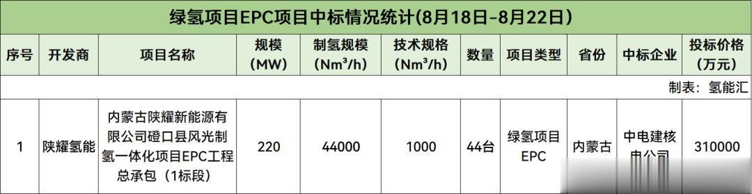 据氢能汇统计,本周1个绿氢项目EPC项目开标,项目为内蒙古陕耀新能源有限公司磴口县风光制氢一体化项目EPC工程总承包(1标段),由中电建核电公司中标,投标报价为310000万元。
