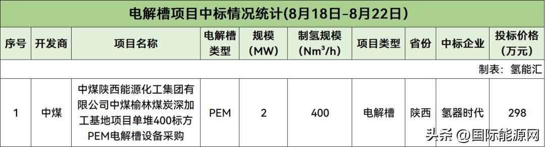 电解槽项目有1个,招标人分别是中煤,中标企业为氢器时代。