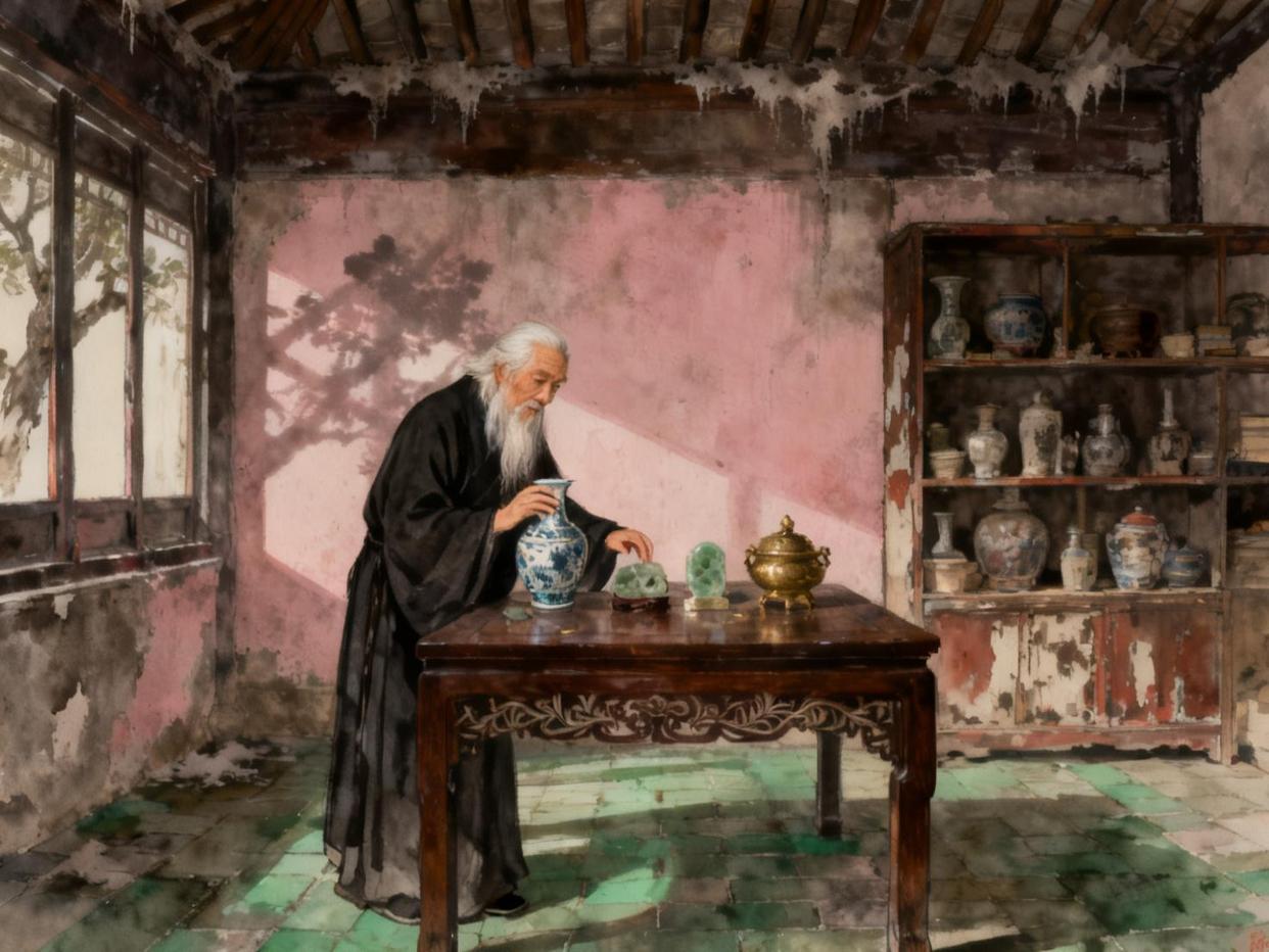 他缓缓地站起身,将手中的珐琅彩茶碗小心翼翼地放回桌上,动作轻柔,仿佛那不是一只碗,而是一个沉睡的婴孩。