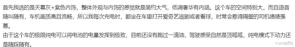 对于动力系统消费者的评价是,增程式车型可以将电池电量发挥到极致,驾驶感受较好,即使纯电模式动力也是随踩随有,反观同级别其它车型,低电量会启动增程器,用车成本也会稍高。