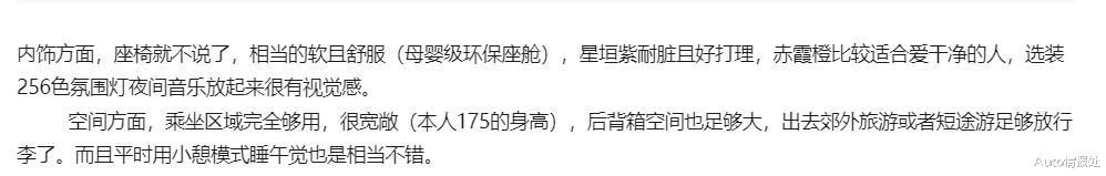 以上口碑评价都是消费者的真实评价:消费者对于内饰的用料比较满意,大量软性材质让乘客感觉舒适,256色氛围灯夜晚也很有氛围感,空间也很宽敞,无论是短途出行还是自驾游,都完全够用。
