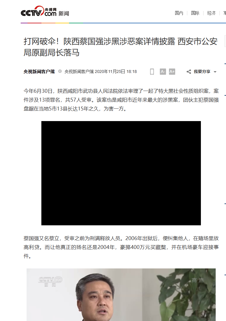 2.《打网破伞!陕西蔡国强涉黑涉恶案详情披露 西安市公安局原副局长落马》,黎佳易