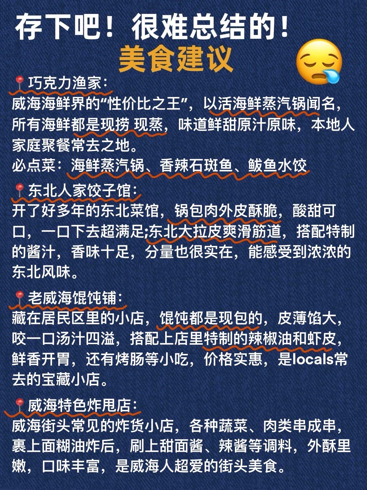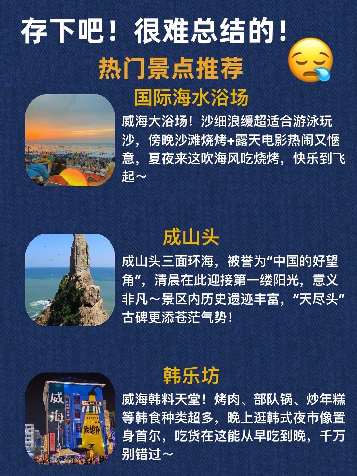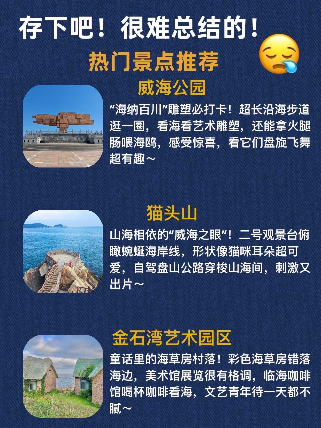 🌊必打卡景点: 火炬八街——威海“小镰仓”那香海——钻石沙滩+ins风秋千🏖️刘公岛——历史感小岛⛴️看猫头山——山海相依🌅二号观景台记得取去! 韩乐坊——韩餐天堂🍲
