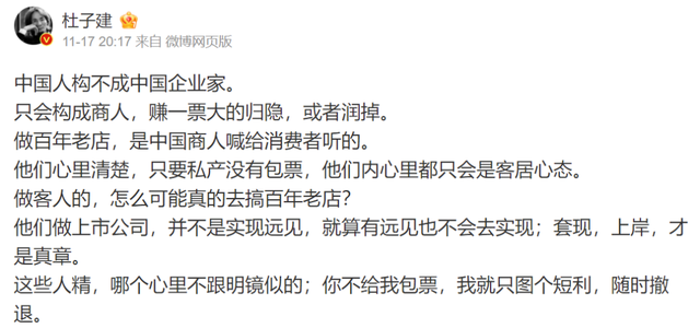 杜子建老师前两日谈到中国没有企业家只有商人,因为产权没有保障,他们都是做客心态,怎么会有百年老店。