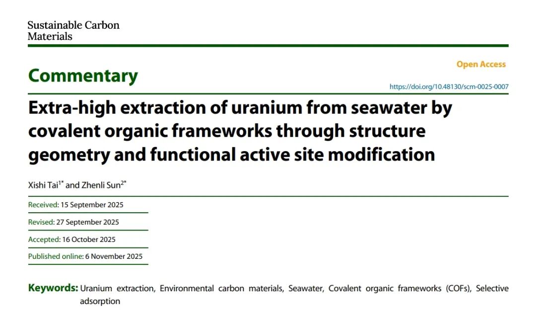 近日,一项关于从海水中高效提取铀的研究成果在《可持续碳材料》上发表,引起了能源与材料科学领域的广泛关注。该论文题为《通过结构几何与功能活性位点修饰实现共价有机框架对海水中铀的超高提取》,由潍坊大学的台夕市教授与华北电力大学的孙振丽共同主导完成。研究团队通过精巧的分子结构设计,显著提升了从海水中提取铀的效率和选择性,为未来核燃料的可持续供应开辟了新路径。