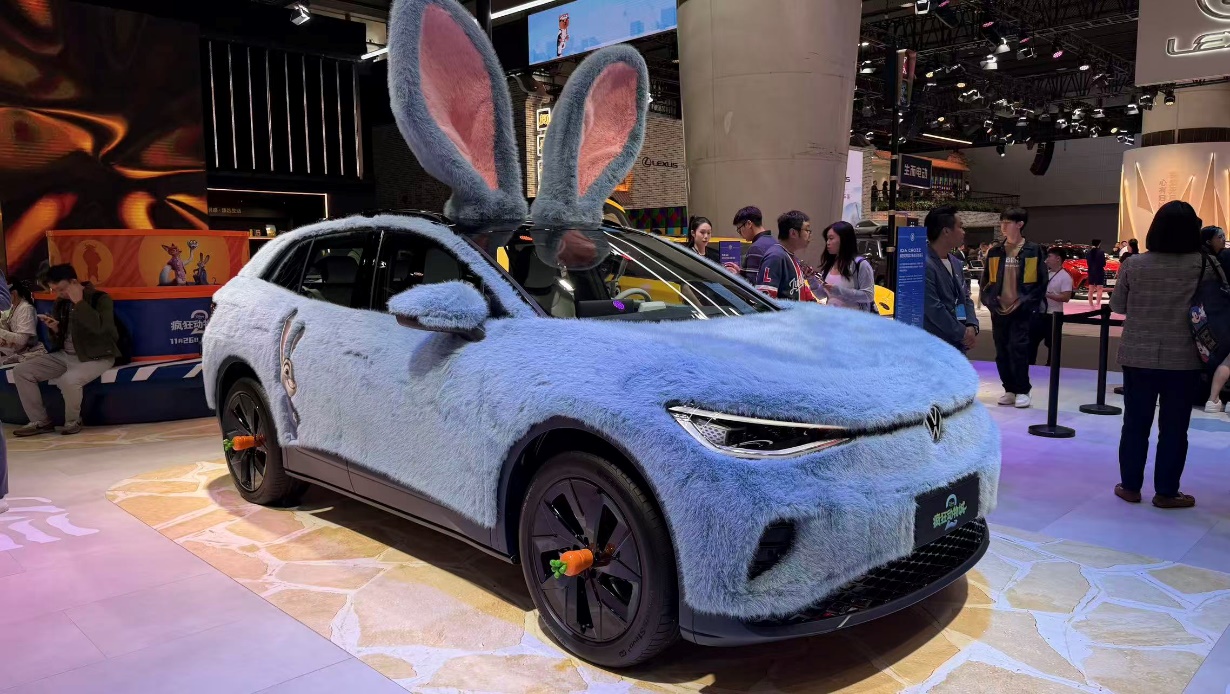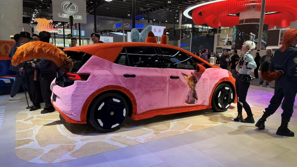首先,一走进1.1号馆,视线瞬间就被一片欢快的橙色抓住了。没错,这就是本次车展的“流量担当”之一——ID.3 GTX 《疯狂动物城2》尼克定制展车。