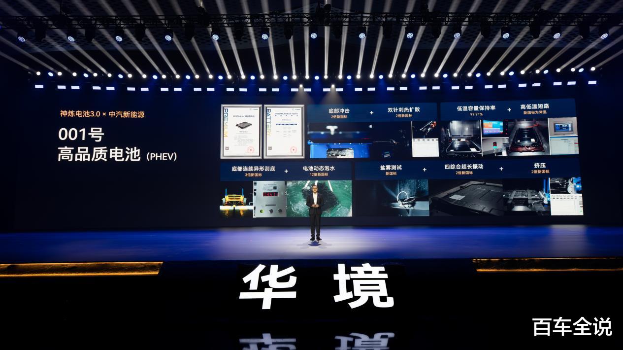 三电安全层面,华境S神炼电池3.0搭载宁德时代超级增·混电芯,打造独有的系统级五“零”安全,达成766亿公里零自燃的实战记录。该电池实现极限设计、极限制造、极限验证三大进化,PPB航空级制造标准,实现十亿分之一的严苛管控,为用户出行保驾护航。在极限验证中,神炼电池3.0不仅以裸电芯硬抗1500J(10倍新国标能量)底部撞击,仍能做到不起火、不爆炸,并通过贴近用户使用场景、超越新国标的四大串行测试,获中汽新能源001号(PHEV)高品质电池验证证书。新国标的四大串行测试,获中汽新能源001号(PHEV)高品质电池验证证书。