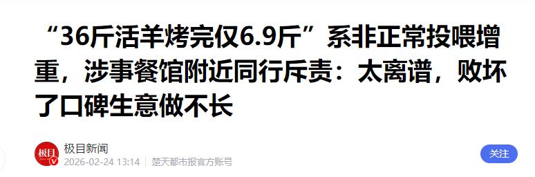 极目新闻2026-02-24——“36斤活羊烤完仅6.9斤”系非正常投喂增重,涉事餐馆附近同行斥责:太离谱,败坏了口碑生意做不长