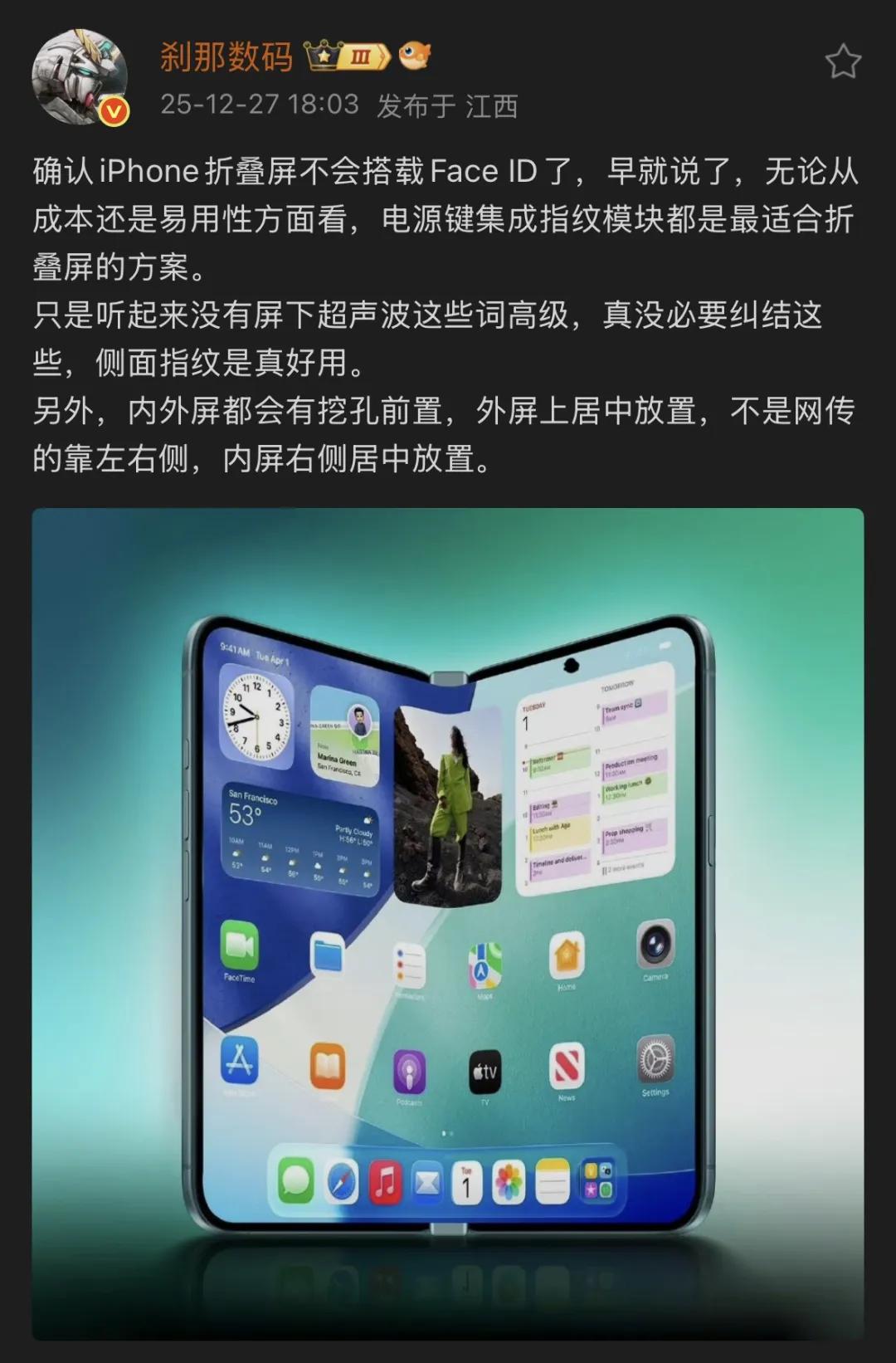 此外,该博主还再次确认了折叠屏iPhone将“放弃Face ID,改用Touch ID”的消息,并认为“电源键集成指纹模块是最适合折叠屏的方案”。