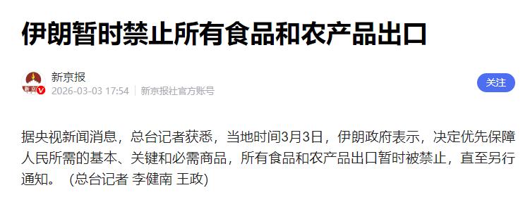 3月3日伊朗全面叫停食品及农产品出口。