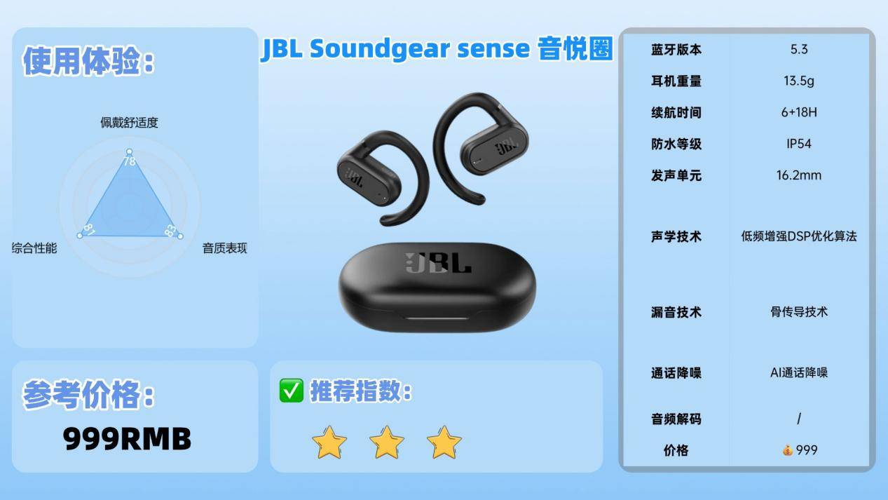 JBL Soundgear Sense音悦圈耳机延续了品牌在运动音频领域的专业优势。在音质方面,它配备16.2mm大尺寸动圈单元,结合轻量多层复合振膜,呈现出JBL典型的饱满音效。通过低频增强DSP算法优化,低音更具深度与弹性,听感厚实有力。在通话使用时,耳机采用降噪技术与定向拾音,即便置身嘈杂环境,也能保证语音清晰稳定。