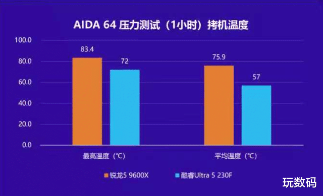 在一个小时AIDA 64拷机中,9600X的最高温度为83.4℃,230F仅72℃;平均温度差别也非常大,前者为75.9℃,后者57℃。