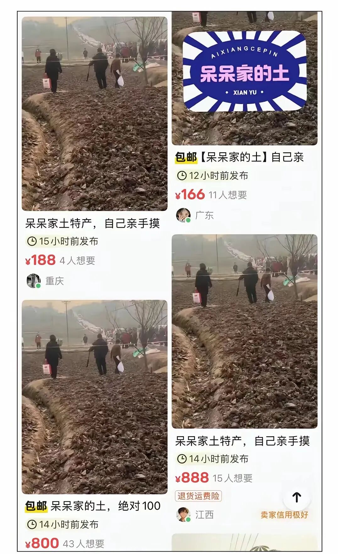 • 同村邻居纷纷开直播赚钱• 小主播跑去门口蹭流量• 更离谱的是,有人把呆呆家门口的土挖走,在网上当“发财土”“转运土”卖,标价从几十元到888元一两不等